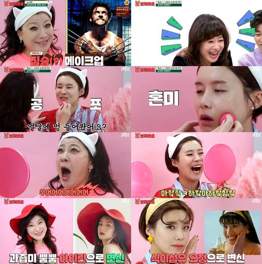 장도연이 노사연의 얼굴에 아이돌 메이크업을 했지만 너무 과하게 됐다. 노사연은 완성된 메이크업을 보며 "뭐한거야! 오랜만에 참는다"라고 말했다.