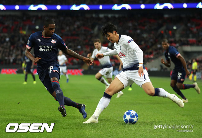 손흥민은 전반 중반 경기가 잘 풀리지 않자 모우라와 위치를 바꾸는 등 적극적인 포지션 체인지로 PSV에 혼란을 줬다. 손흥민은 전반 40분 박스 안으로 돌파해 상대 선수와 경합 도중 넘어졌지만 주심은 휘슬을 불지 않았다. 1분 뒤 좌측면서 올린 크로스는 수비 벽에 막혔다.
