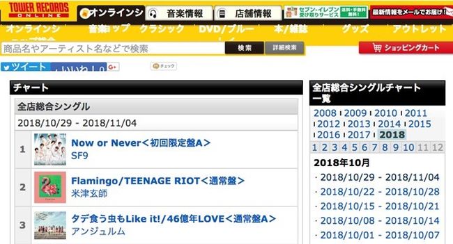 6일 일본 타워레코드에 따르면 SF9의 새 싱글 ‘나우 오어 네버(Now or Never)’는 전점 종합 싱글 주간차트(2018.10.29~2018.11.04 집계)에서 1위를 차지했다. 오리콘 주간차트 3위로 진입한 데 이어 또다시 최상위권의 발매 성적을 보이며 놀라운 성과를 거듭 보여주고 있다.