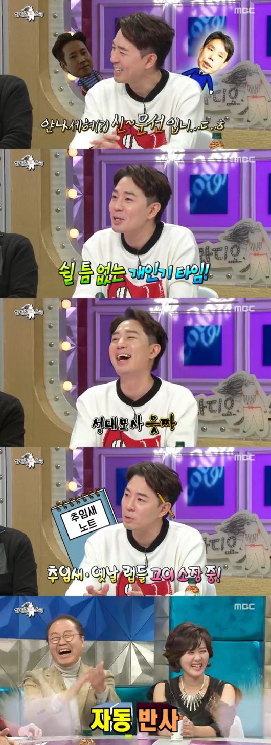 뿐만 아니라 "추임새나 옛날 랩들 모아놨다"면서 추임새 노트가 보물1호라고 했고, 이선균, 이정재, 신문선, 최홍만 등 성대모사 개인기를 대방출했다. 특히 MSG토크로 잔망美도 터트려 스튜디오를 뒤집어놓았다.