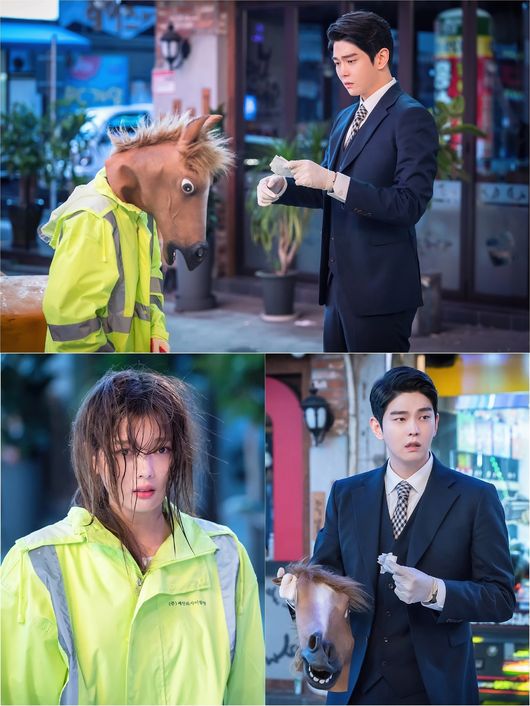 이런 가운데 공개된 윤균상과 김유정의 커플 스틸은 첫 만남부터 심상치 않은 극과 극 비주얼로 궁금증을 선사한다. 머리부터 발끝까지 한 치의 오차도 없이 ‘완전무결’한 자태의 윤균상은 거리에서 환경미화원 복장을 한 말머리의 등장에 여지없이 불결 레이더가 발동, 반듯했던 눈썹이 꿈틀거린다. 위생장갑까지 장착한 윤균상이 말머리를 벗기자 땀범벅에 헝클어진 머리를 한 ‘청포녀’ 김유정이 깜짝 등장한다. 가면 속 예상치 못한 비주얼의 등장에 놀란 기색을 감추지 못하는 윤균상과 흐트러진 머리 사이로 왠지 처량해 보이는 김유정의 눈빛이 대비를 이루며 궁금증을 유발한다. ‘말머리 소동’으로 첫 만남부터 짠내 폭발 흑역사를 예고한 길오솔과 장선결이 만들어갈 로맨스가 벌써부터 호기심을 자극한다.