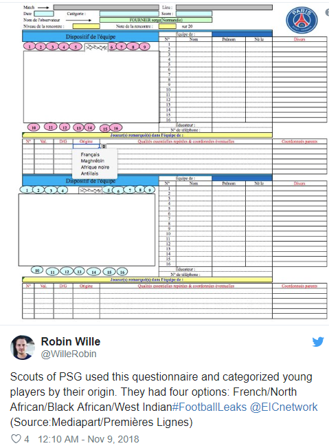 앞서 독일 '슈피겔'은 지난 8일 '풋볼리크스'의 정보를 인용해서 "PSG의 스카우팅 부서는 2013년부터 스카우팅 과정에서 '인종'을 카테고리로 유소년 선수들을 분류했다"고 폭로했다.