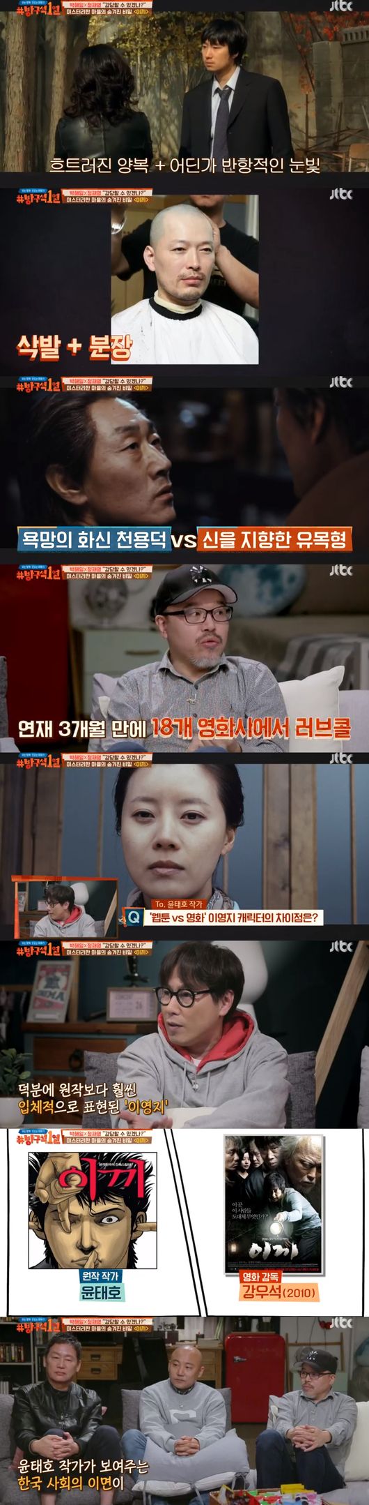 9일 방송된 JTBC '방구석 1열' 28회에서는 웹툰을 원작으로 한 영화 '이끼'와 '신과 함께'를 다루게 됐다. 원작 웹툰인 '이끼'의 윤태호 작가와 '신과 함께'의 주호민 작가, '신과 함께'를 만든 원동연 제작자가 함께 했다.