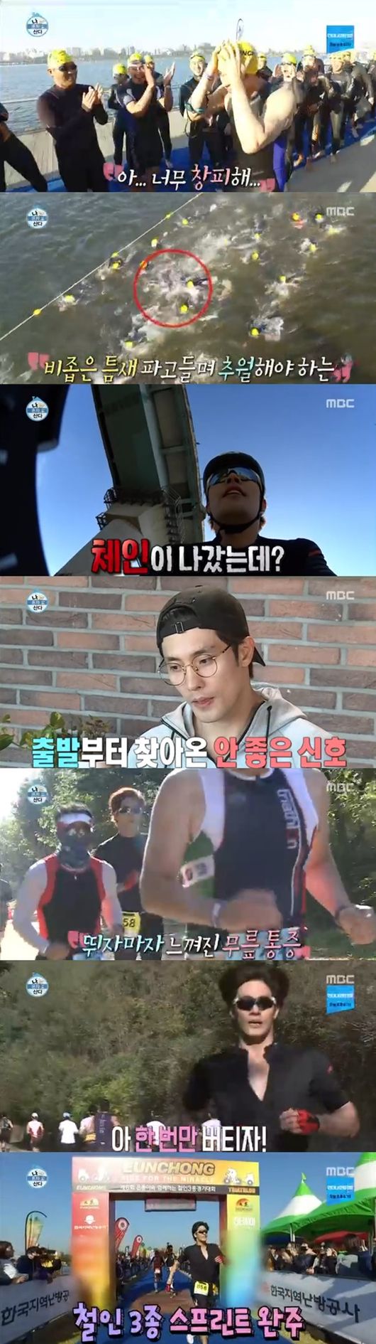 이날 성훈은 자동차 안에서 아이유 노래를 배경으로 바나나를 순식간에 5개를 먹어치웠다. 그렇게 한강으로 달려간 성훈. 그는 "철인3종 경기 하루 전날 한강에서 수영 연습을 한 시간 동안 할 수 있다. 모든 사람들이 다 해야 한다"고 한강에 나간 이유를 밝혔다. 그는 858 번호표를 받았고, '철인 858'로 변신했다. 그런 성훈의 곁에 지누션의 션이 다가왔다. 션을 보고 성훈은 "형"이라며 반가워했다.