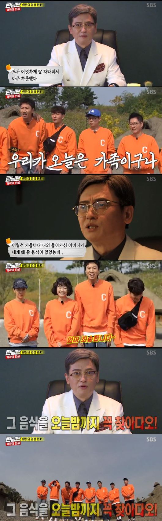 이날 멤버들은 갑작스럽게 김병옥의 영상이 등장하자 놀란 기색을 보였다. 영상 속 김병옥은 "사랑하는 아들 딸들아"라고 운을 뗀 뒤 "내가 너희들을 여기 부른 이유는 가을마다 돌아가신 어머니가 해준 음식이 있었는데 아무리 찾으려고 해도 그 음식이 기억나지 않아. 내가 그토록 찾는 음식을 오늘 밤까지 꼭 찾아와라"고 말했고, 이를 듣던 멤버들은 "오늘은 우리가 8남매인가 보다"라고 납득해 웃음을 안겼다.
