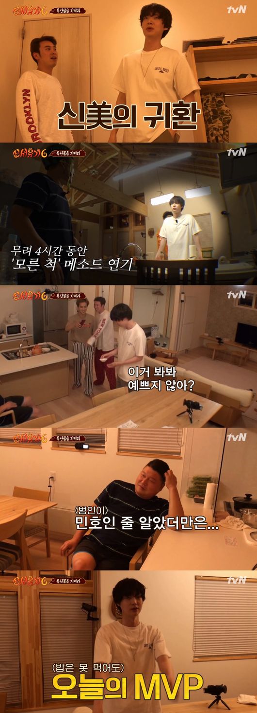기상미션을 할 때도 ‘신美’ 안재현의 활약은 놀라웠다. 멤버들은 대게, 멜론, 연어알, 맥주, 감자, 옥수수를 감춰야 했다. 하지만 이것들을 받고 나오자마자 멤버들이 달려들어 파괴했다.