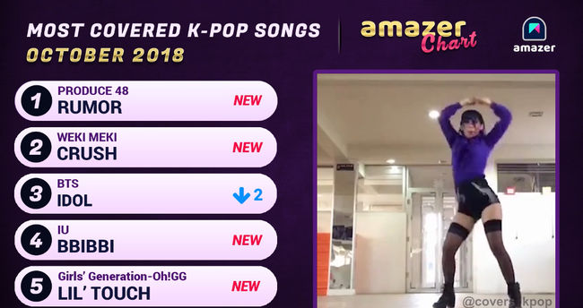 아이즈원(IZONE)이 Mnet '프로듀스48' 경연곡으로 발매한 'RUMOR'가 K-POP 커버 차트(어메이저 차트)에서 10월동안 가장 많이 커버된 곡으로 꼽혔다.