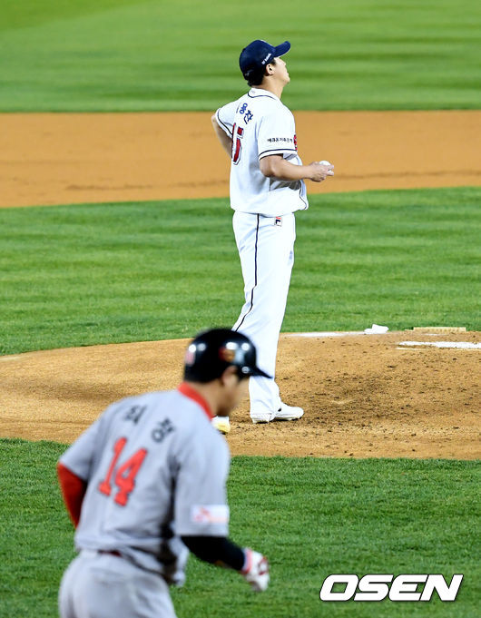 이날 두산 선발 이용찬은 시작부터 볼넷은 내주며 만루 위기에 몰렸다. 선두타자 김강민을 볼넷으로 내보낸 이용찬은 이어 한동민과 최정까지 볼넷을 허용해 만루 위기에 몰렸다. 4번타자 로맥을 유격수 땅볼로 처리했지만, 그사이 3루 주자가 홈을 밟았다.