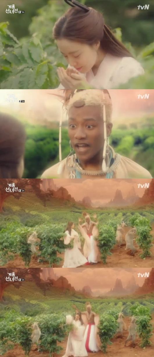 그러면서 선옥남은 선계 커피 신선 칼디(한현민 분)에게 좋은 커피를 찾아내는 실력을 인정받고 함께 춤을 추며 행복해 했다. 갑작스럽게 코믹스럽게 바뀐 화면으로 시청자에게 색다른 재미를 안겼다.