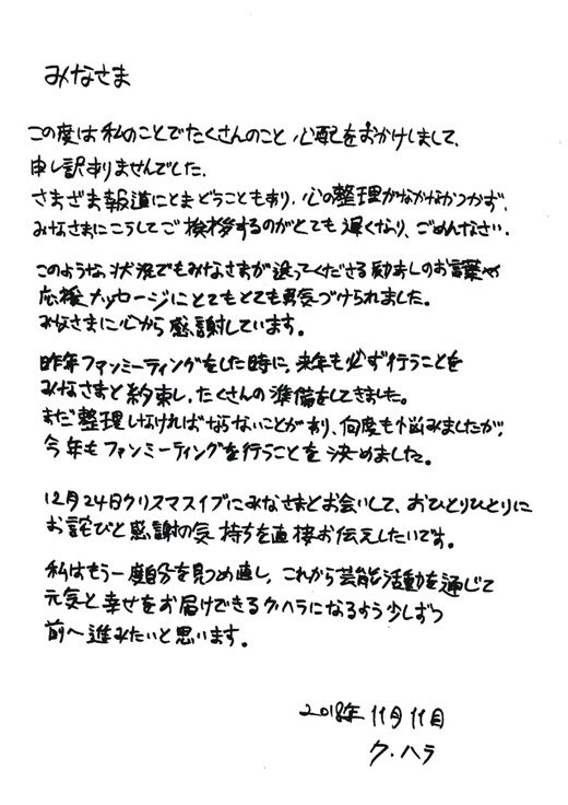구하라는 12일 일본 공식 사이트를 통해 오는 12월 24일 크리스마스 이브 팬미팅을 진행한다는 내용의 자필편지를 게재했다.