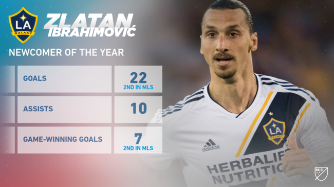 즐라탄 이브라히모비치(LA 갤럭시)가 2018 MLS 신입 선수상을 수상했다.