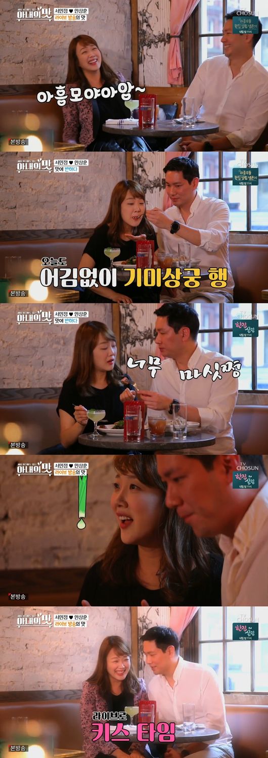 남편은 아내에게 리조또를 먹여주며 훈훈한 분위기를 자아냈다. 두 사람은 음식을 먹으면서도 얼굴에서 웃음이 떠나지 않았다. 이어 서민정도 안상훈에게 오리 고기를 먹여주기도 했다. 이 부부의 소호 데이트는 보는 이들도 흐뭇하게 만들 정도로 애틋했다./ purplish@osen.co.kr