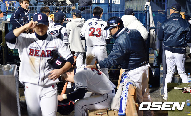 경기를 마친 뒤 두산은 환호하는 SK 선수단을 뒤로한 채 쓸쓸하게 더그아웃으로 향했다. 이번 한국시리즈에서 24타수 1안타(.042)로 침묵했고, 또 시리즈 마지막 아웃을 당한 박건우는 입을 굳게 다물고 눈물을 참아내는 모습이었다. 올 시즌을 끝으로 요미우리 자이언츠로 떠나게 된 고토 코지 타격 코치도 해피 엔딩으로 끝나지 못한 두산과의 인연에 항상 보여줬던 웃는 얼굴이 아닌 굳은 표정으로 그라운드를 빠져나갔다. 선수단은 하나같이 침통한 표정으로 짐을 싸고 라커룸으로 이동했다.