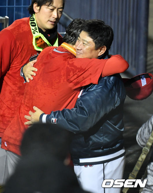 패배의 아픔은 쓰디 썼다. 그러나 명경기 호흡을 함께 맞춘 승자 SK를 향해서는 박수를 보냈다. 김태형 감독은 1루 더그아웃으로 찾아온 힐만 SK 감독을 향해 박수와 함께 축하 메시지를 전했다. 또 손을 맞잡고, 포옹을 하며 '적장'이 아닌 '야구인 동료'로서 외국인 감독 첫 우승을 달성한 힐만 감독을 축하해줬다.