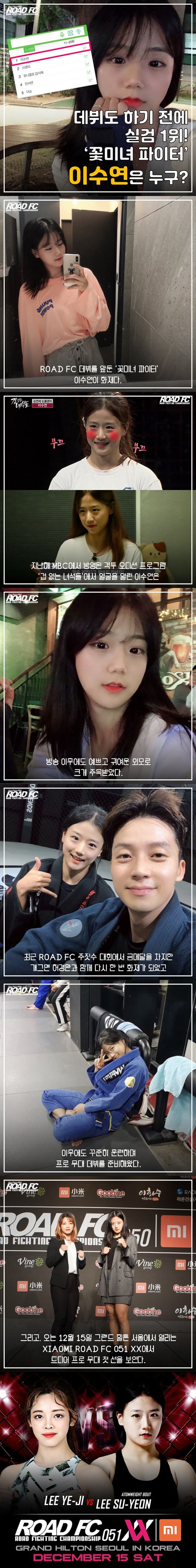 이수연은 12월 15일 그랜드 힐튼 서울에서 열리는 XIAOMI ROAD FC 051 XX에 출전한다. 상대는 ‘여고생 파이터’로 이름을 알렸던 이예지다.