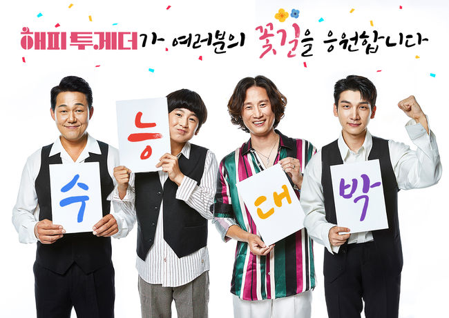 한편, ‘해피 투게더’는 11월 15일 대학수학능력시험을 앞둔 수험생들을 응원하는 수능 대박 포스터와 셀카 영상까지 공개해 더욱 기대를 모으고 있다. 먼저, 수능 대박 포스터는 배우 박성웅, 최로운, 송새벽과 한상혁이 함께 ‘수능 대박’이라는 응원 문구를 들고 있어 이목을 집중시킨다. 네 배우들의 훈훈한 미소와 함께 ‘‘해피 투게더’가 여러분의 꽃길을 응원합니다’라는 메시지를 전하는 이번 포스터는 수험생들뿐만 아니라 꽃길을 염원하는 모든 이들에게 따스한 에너지를 선사하고 있다.