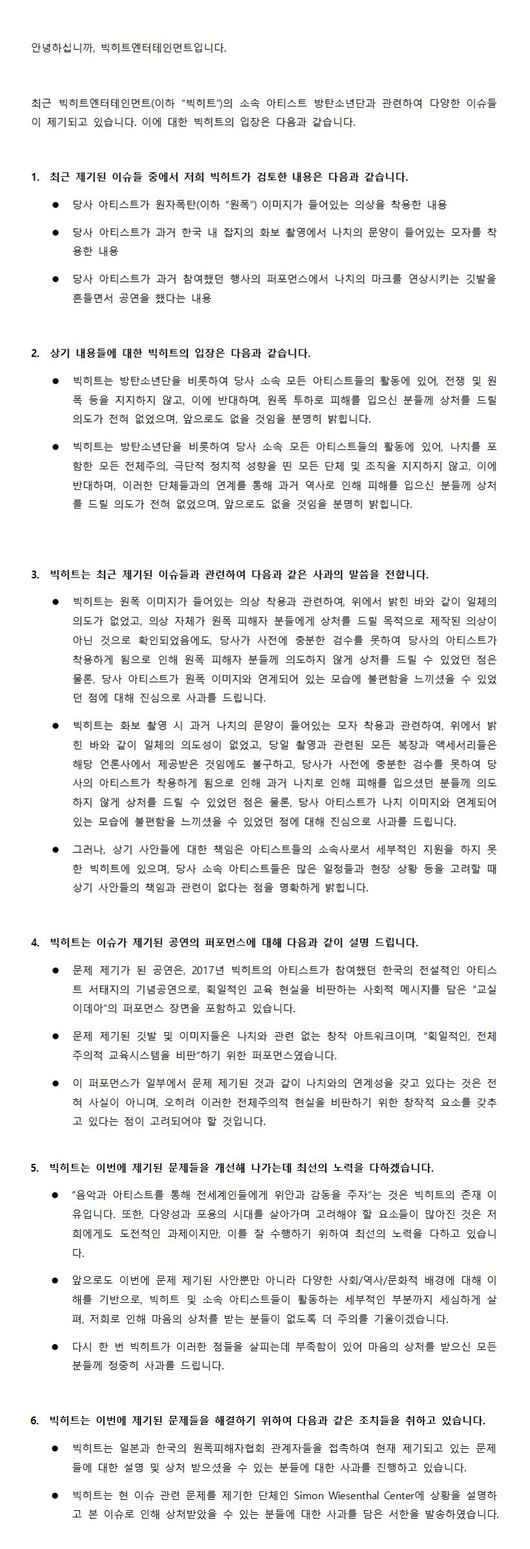 이어 소속사는 원폭 및 나치 등 극단적 단체 조직을 지지하지 않는다는 점을 명백히 하며 "다양한 사회 역사 문화적 배경에 대한 이해를 기반으로 빅히트 및 소속 아티스트들이 활동하는 세부적 부분까지 세심히 살펴 저희로 인해 마음의 상처를 받는 분들이 없도록 더 주의를 기울이겠다"고 덧붙였다.