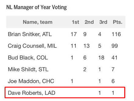 투표는 1위표, 2위표, 3위표에 차등점수를 매겨 최종점수를 합산해 수상자를 가린다. 그런데 투표권이 있는 30명의 기자 중 로버츠 감독에게 투표한 기자는 단 한 명이었다. 그것도 3등표 하나만 있었다. 결국 로버츠 감독은 단 1점을 받아 6명 중 꼴찌를 기록했다.