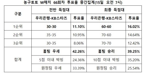 WKBL 우리은행-KB스타즈전 대상 농구토토 W매치 66회차 투표율 중간집계