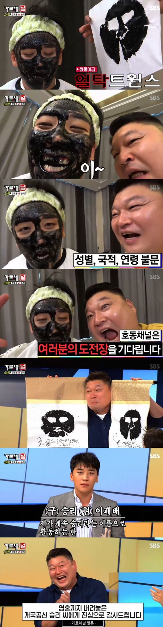 승리는 "다시는 휴지를 쓰지 말아야겠다 생각, 왜 내가 던지려니까 바람이 부냐"며 억울해하면서 이어 "파일럿 방송나가고 어머니가 고생한다고 백숙가져왔다"며 신세한탄했다. 강호동은 오징어 먹물을 꼼꼼히 발랐다. 비린내가 진동하자 승리는 "숨쉬기가 힘들다"며 고통을 호소, 이어 탁본종이로 마무리했다. 승리는 우스꽝스러워진 자신의 얼굴을 보고 이성을 잃었다. 아낌없이 내려놓았다. 승부자답게 패배를 인정, 승리는 "꼭 누군가 호동이 형을 이겨주길 바란다"며 마지막 메시지를 남겼다. 강호동은 두 장의 탁본을 들고 약올렸다. 승리는 "다시 승리할 때까지 계속 도전할 것"이라 했다. 개국공신 승리의 위엄이었다.