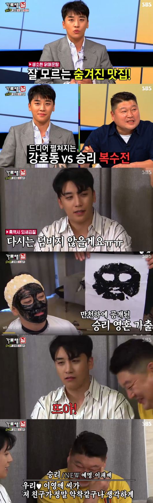 승리는 강호동을 보자마자 "내가 하찮은거 때문에 잠을 못 잤다. 어서 대결합시다"라고 말했다. 파일럿 방송 때 강호동과 대결에서 진 승리는 복수를 다짐했다.