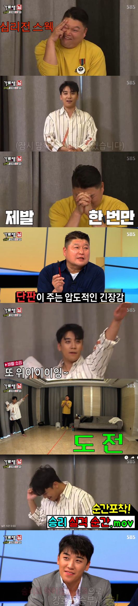 승리의 집에서 진행된 대결, 승리는 "왜 삼행큐는 안 보여주냐"고 했고, 강호동은 "재미없으면 무조건 편집"이라고 해 승리를 당황시켰다. 드디어 결전의 순간, 무조건 단판승부를 하기로 했다. 승리는 이영애를 떠올리며 "저 친구가 정말 악착같구나 인상을 심어줄 것"이라 외쳤다.