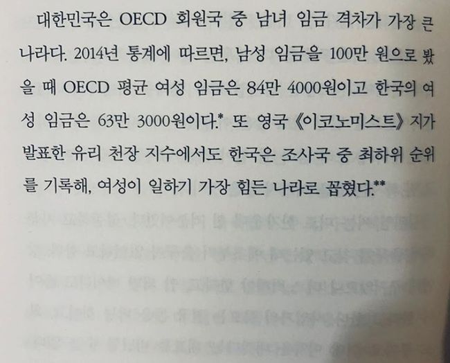 공개된 사진은 책의 한 문구를 촬영한 것으로, "대한민국은 OECD 회원국 중 남녀 임금 격차가 가장 큰 나라다. 2014년 통계에 따르면, 남성 임금을 100만 원으로 봤을 때 평균 여성 임금은 84만 4천 원이고, 한국의 여성 임금은 63만 3천 원이다"라는 내용이 담겨져 있다. "유리 천장 지수에서도 한국은 조사국 중 최하위 순위를 기록해 여성이 일하기 가장 힘든 나라로 꼽혔다"라는 내용도 포함돼 있다.