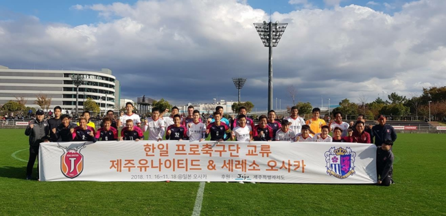 제주는 17일 오후 세레소 오사카 클럽하우스에서 한일 프로축구단 교류 친선경기에서 세레소와 우정의 맞대결을 펼쳤다. 제주특별자치도가 후원한 이번 친선전은 한일 프로축구단 교류를 통해 양국 간의 친목과 화합을 다지기 위해 개최됐다.
