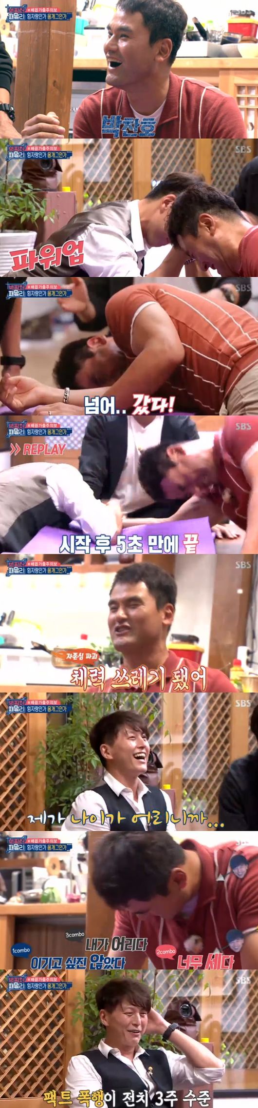 급기야 차인표가 기권, 최강 팔뚝왕은 류수영이 됐다. 차인표는 발씨름 제안했다. 하지만 바로 박찬호에게 패했고 만신창이가 된 얼굴로 "상어냐, 자꾸 흔드냐"고 말해 폭소하게 했다. 이어 류수영도 도전, 차인표는 "은근히 하체가 약할 것"이라 예상했다. 그리고 바로 박찬호에게 하체대결은 K.O 당했다. 박찬호는 "남자는 하체"라며 자신만만했다.