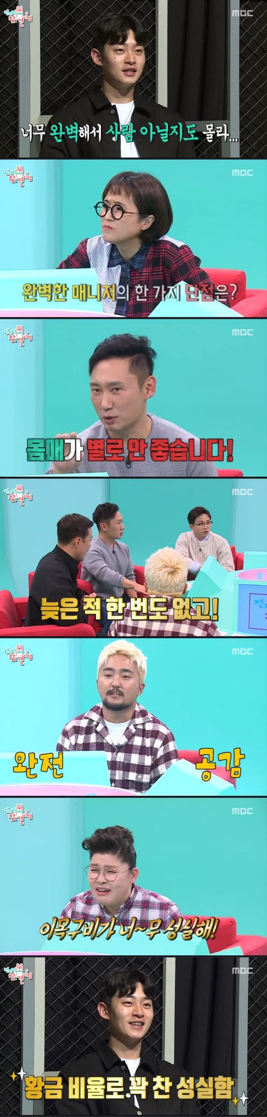 개그맨 이승윤이 함께 일하는 강현석 매니저를 특급 칭찬, 비주얼만큼 성격까지 완벽해 모두를 놀라게 했다.
