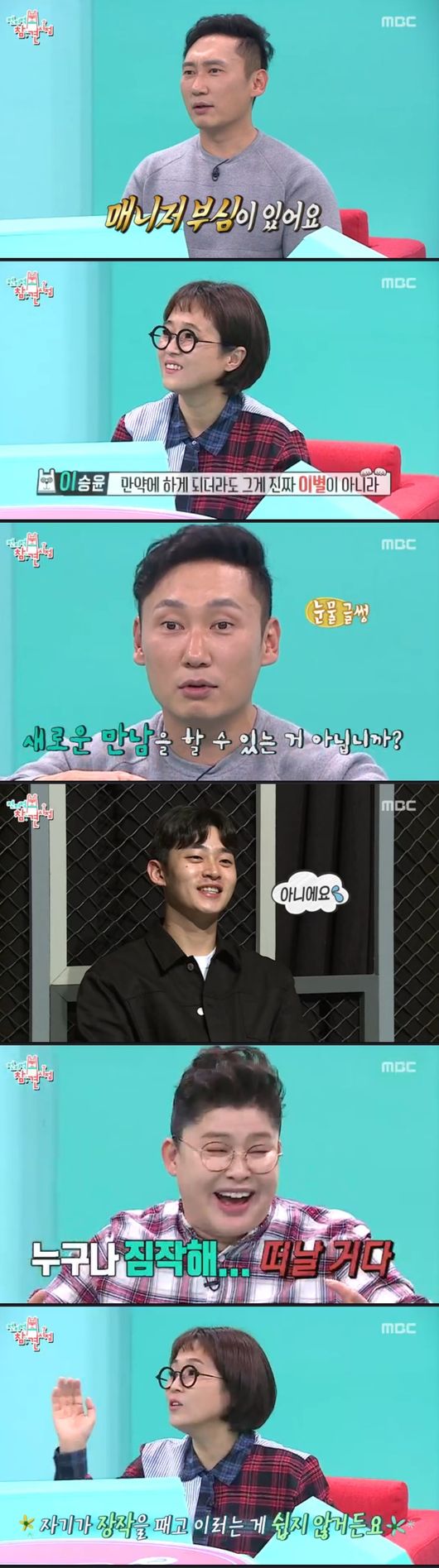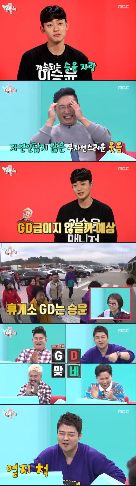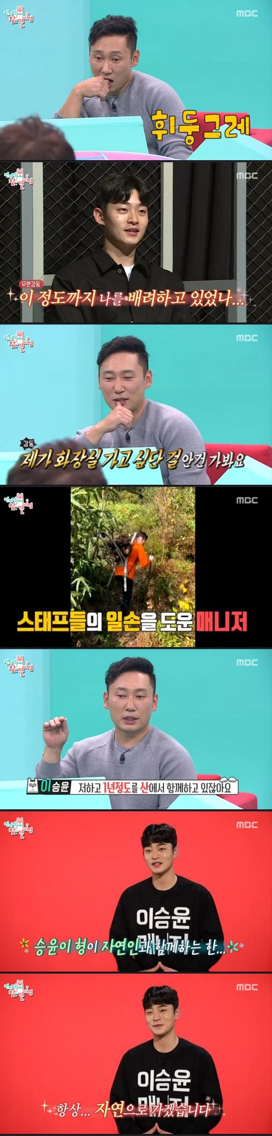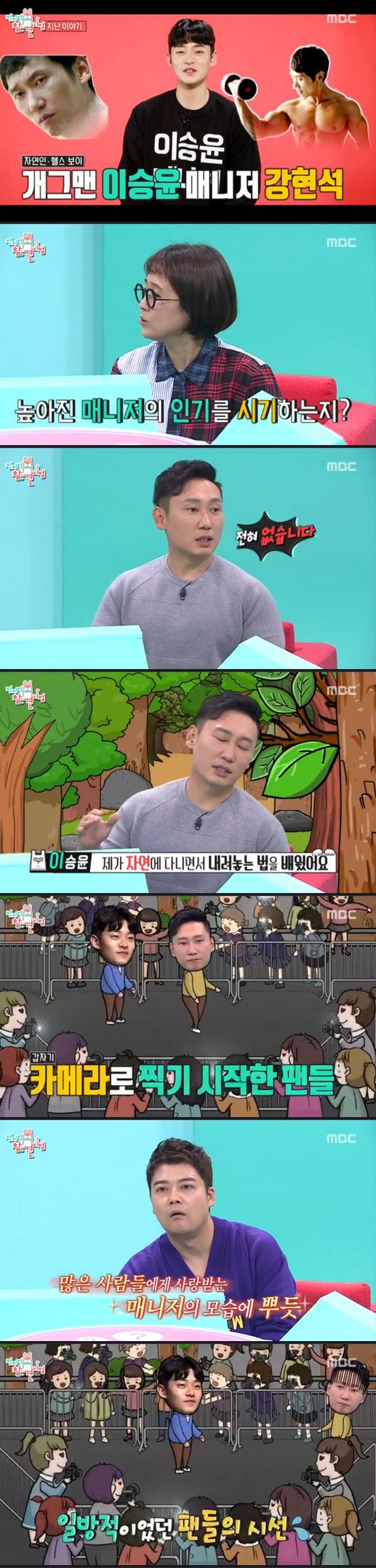 이날 MC들은 개그맨 이승윤에게 매니저 강현석이 공개되자마자 반응이 뜨겁다고 했다. 서인국 닮았다는 반응이었다고. 이승윤은 "뿌듯하다"면서 "보통 매니저가 방송국을 동분서주하지만 존재만으로 출연성사됐다"며 고마워했다. 매니저 인기를 시기하지 않냐는 질문에는 "전혀 없다, 자연다니며 내려놓았다, 삶에 있어 실기와 질투는 중요하지 않다"면서 "난 얼굴로 승부하지 않는다, 매니저에 대한 지금의 관심들이 뿌듯하다"며 매니저를 챙겼다.