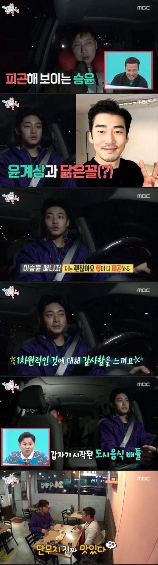 자연에서의 2박3일을 보낸 후, 도시로 올라오니 수염이 덥수룩해진 두 사람이었다. 특히 수염난 강매니저를 보며 MC들은 "변요한, 윤계상 닮았다"며 매력있는 그의 얼굴을 극찬했다. 갑자기 두 사람은 도시음식 배틀을 시작했다. 그리곤 중국집에 도착하자마자 먹방을 시작했다. 승윤의 앞치마도 챙겨주는 등 자상함도 보였다.