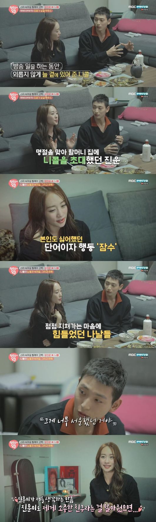 두 사람은 게장을 맛있게 먹으며 그간 있었던 이야기를 하나 둘 풀어놓기 시작했다. 정진운은 지금까지 친한 동갑 친구들을 처음 니콜이 소개시켜주었다며 “내가 고마운 것은 내가 생각보다 낯을 많이 가린다. 지금까지 외롭지 않게, 시작을 할 수 있게 도와준 네가 너무 고마웠다”고 속마음을 전했다.