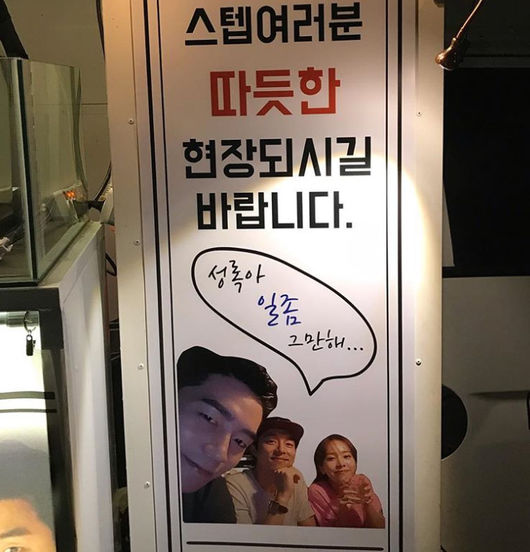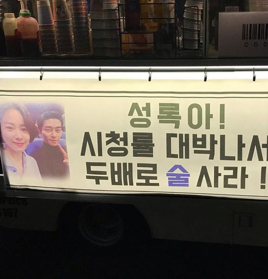 "성록아 시청률 대박나서 두배로 술 사라!", "성록아 일 좀 그만해" 라는 센스 넘치는 문구가 인상적. 공유와 한지민은 신성록과 영화 '밀정'에서 연기 호흡을 맞춘 바 있다.
