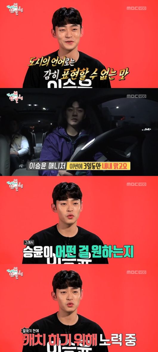 이승윤은 매니저의 단점이 무어냐는 질문에 "굳이 뽑자면 몸매가 별로 안 좋다"며 살이 쪘다고 했다. 이어 "지각을 한 적이 없다. 일에 대해 뭐라고 한 적이 한번도 없다"고 부연 설명했다. 꽉찬 성실함으로 열심히 사는 건실한 젊은 청년이라는 것.