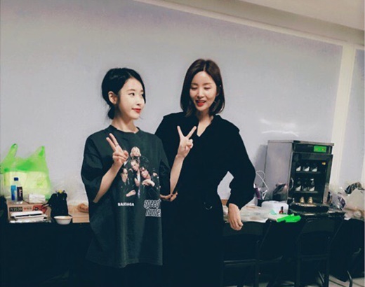 사진 속 박솔미는 아이유의 옆에서 포즈를 취하고 있다. 아이유 콘서트 참석 후 찍은 사진으로 보인다.