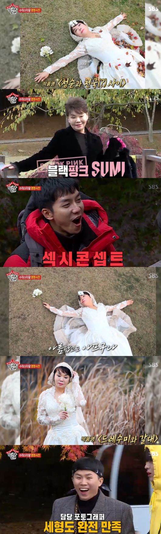 다음은 세형이 요구한 청순컨셉으로 사진을 찍기로 했다. 김수미는 순백의드레스 입고 등장했다. 청순이 컨셉이었지만 럭셔리함이 묻어났다. 김수미는 갑자기 "아이디어가 떠올랐다"면서 드레스를 입고 들판에 누웠다. 그리곤 꽃을 잡는 느낌으로 아련하게 표정을 지었고, 멤버들은 사진의 분위기를 더하기 위해 떨어지는 낙엽까지 연출했다. 김수미는 "이 꽃들을 더 보고싶다, 더 살고싶다"고 말하면서도 무거운 분위기를 유쾌하게 이끌었다. 어디로 튈지 모르는 팔색조 매력의 사부다웠다. 그녀의 네가지 콘셉트의 '영정사진' 결과를 더욱 궁금하게 했다. /ssu0818@osen.co.kr