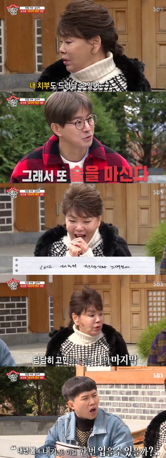 이어 가상이지만, 마지막하루를 유쾌하게 시작했다. 김수미는 보자기에 싸여진 자신의 보물들을 꺼냈다. 이어 "내 일기장"이라면서 "그 해의 키워드가 있다, 내 치부도 드러날 수 있다"며 필터링 없는 일기장을 전했다. 일기장이라 더욱 진솔한 얘기들이었다. 김수미는 지막을 상상하며 과거를 읽으면 현재를 살게 된다면서, 일기 습관을 들여보라고 했다. 일기는 내가 나에게 주는 깨달음이라고 했다.