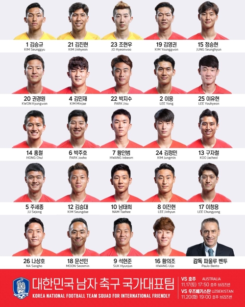 호주 원정에서 한국은 손흥민(토트넘), 기성용(뉴캐슬), 이재성(홀슈타인 킬), 정우영(알 사드), 장현수(FC 도쿄), 황희찬(함부르크) 등 공수의 주축 선수들이 다양한 이유로 참가하지 못했다.