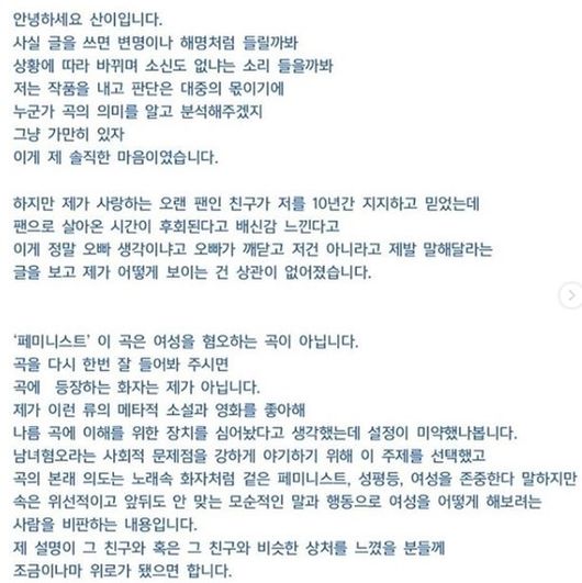 산이는 19일 자신의 SNS에 "미안해 오해가 조금이나마 풀렸으면 좋겠어"라는 글과 함께 자신의 입장 및 노래에 대한 해설을 담은 텍스트 이미지를 게재했다.