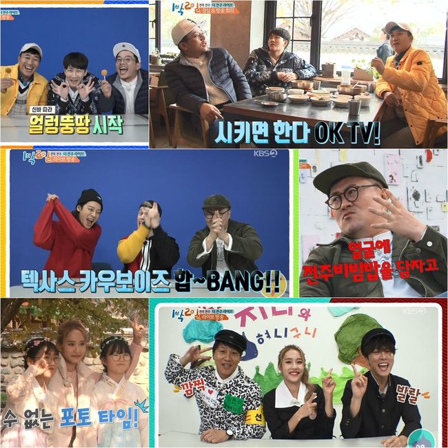지난 18일(일) 방송된 KBS 2TV ‘해피선데이-1박 2일 시즌3’(연출 유일용/이하 1박 2일)는 전라북도 전주로 떠난 ‘더 전주 라이브’ 첫 번째 이야기가 펼쳐졌다. 이 날은 여섯 멤버들이 최근 핵인싸들에게 가장 핫한 1인 미디어 방송에 도전하는 모습이 그려진 가운데 신문물에 대한 정보가 부족한 멤버들을 위해 지니언니-올리버쌤-이용진이 선생님으로 등장해 눈길을 끌었다. 특히 지니언니는 구독자 130만을 거느린 초통령으로, 올러버쌤은 구독자 100만을 보유한 영어 학습 크리에이터로 주가를 올리고 있는 상황. 멤버들은 3인의 엄선된 면접을 걸친 후 차태현-윤동구가 지니언니와 한 팀, 김준호-김종민이 이용진과 한 팀, 데프콘-정준영이 이용진과 한 팀을 이뤘고 개성만점 각 팀이 어떤 콘텐츠를 제작할지 시청자들의 궁금증을 높였다.