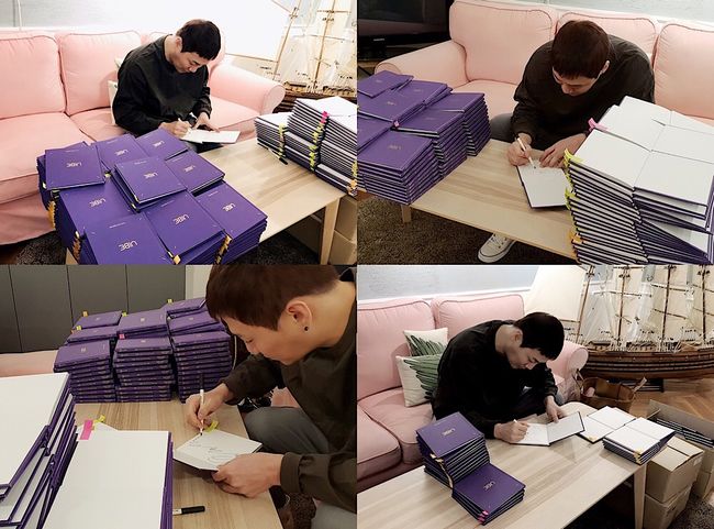 공개된 사진과 영상 속에는 수북하게 쌓인 앨범에 사인을 하는 윤민수의 모습이 담겨있다. 영상 말미 사인을 마친 그는 팬들을 향해 하트를 그려 남다른 팬 사랑을 전했다.