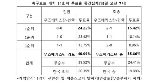 국가대표평가전 우즈베키스탄(홈)-한국(원정)전 축구토토 매치 11회차 중간집계