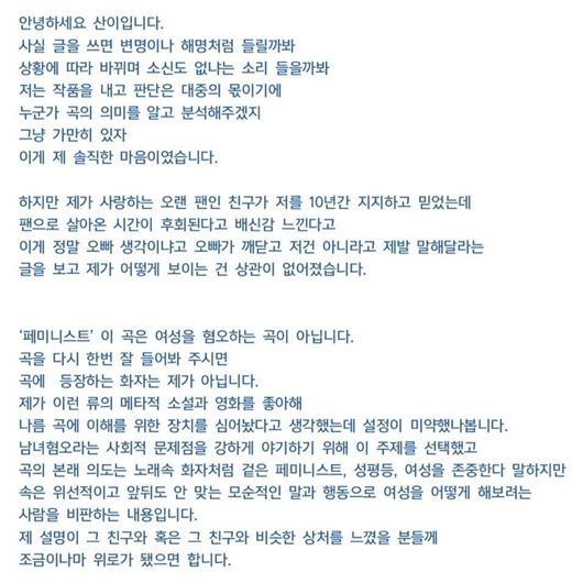 산이는 19일 자신의 SNS에 "미안해. 오해가 조금이나마 풀렸으면 좋겠어"라는 글과 함께 자신을 둘러싼 여혐 논란에 대해 해명하고 신곡 '페미니스트' 랩 가사를 직접 분석한 장문의 글을 캡처해 올렸다.