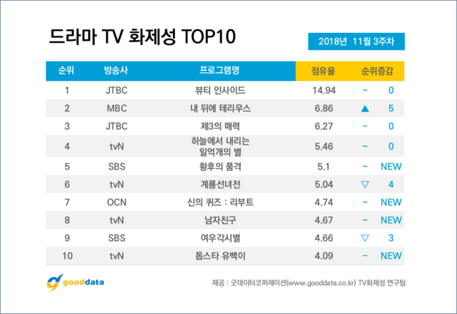 그 뒤로 4위부터 10위 까지는 tvN ‘하늘에서 내리는 일억개의 별’, 방송을 앞두고 있는 SBS ‘황후의 품격’, tvN ‘계룡선녀전’, OCN ‘신의퀴즈: 리부트’, 방송을 앞두고 있는 tvN ‘남자친구’, SBS ‘여우각시별’ 그리고 tvN ‘톱스타 유백이’ 순이다.