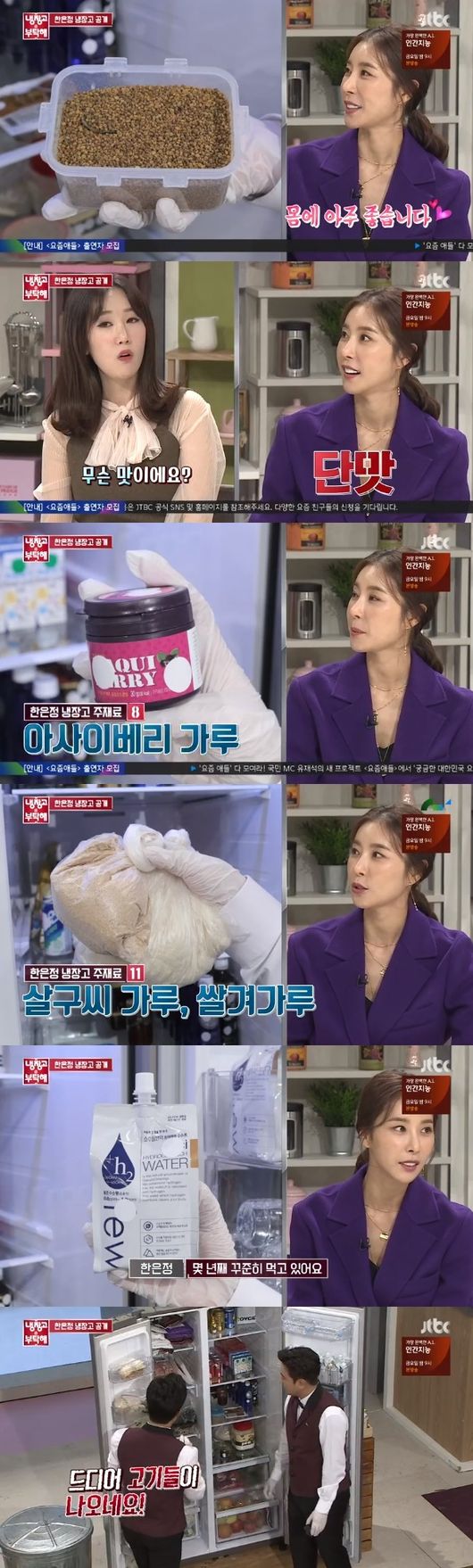 냉장고 안에는 벌화분, 아사이베리 가루, 트러플소스, 살구씨 가루, 쌀겨가루, 알로에 젤, 수소수 등 한은정의 몸매와 건강을 책임지는 아이템들이 시선을 사로잡았다.