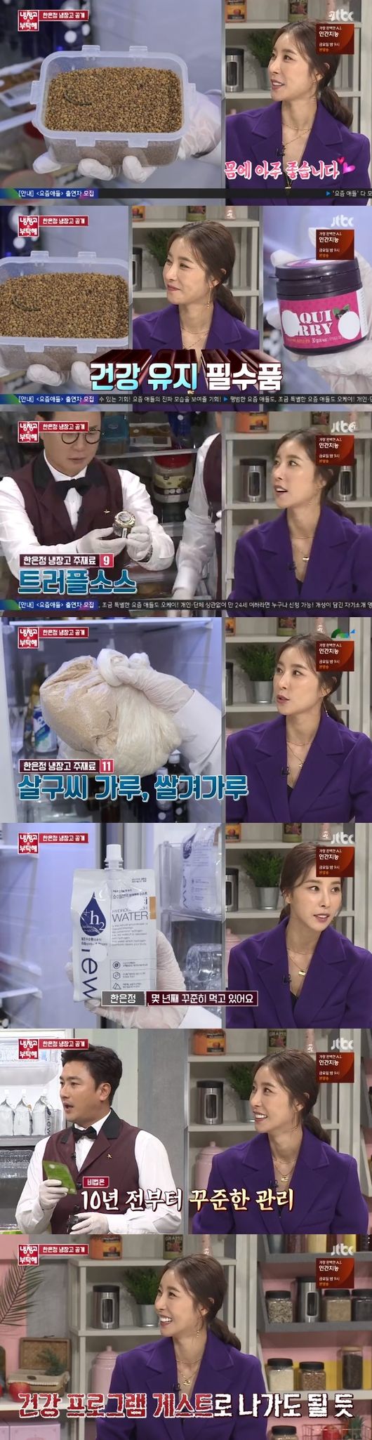 토크를 마치고 김성주와 안정환은 한은정의 냉장고를 살펴봤다. 냉장고 안에는 벌화분을 시작으로 아사이베리 가루, 트러플소스, 살구씨 가루, 쌀겨가루, 알로에 젤, 수소수 등이 눈에 띄었다.