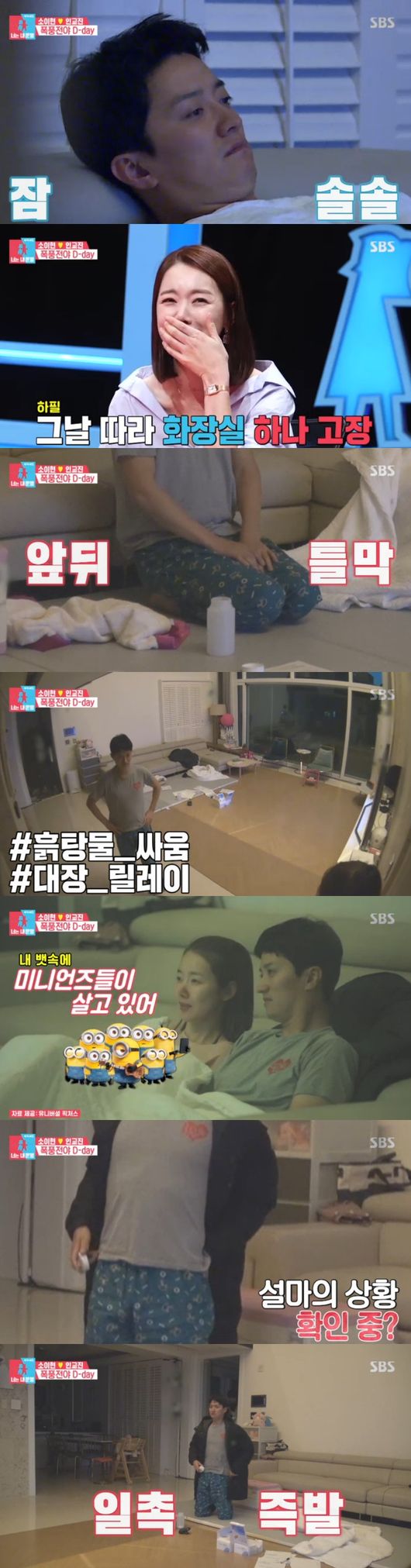 대장내시경을 위해, 장 청소약을 들이켰다. 물까지 총 3L를 마셔야했다. 소이현은 "속에서 부룩부룩 거린다"며 바로 화장실로 향했다. 이와 달리 인교진은 "난 아무렇지 않다"며 신호를 받지 못했다. 심지어 잠이 오려던 찰나, 갑자기 복통을 호소하며 자리에서 일어났다. 인교진은 "훅 온다"며 화장실로 향했다. 하지만 하필 화장실 하나가 고장난 바람에 소이현을 기다려야했다. 인교진은 거실에서 무릎을 꿇고 오매불망 기다렸다. 한숨을 쉬며 뒤늦게 터진 듯 어쩔줄 몰라했다. 두 사람은 날을 꼬박 샜다고 했다. 갈수록 고역인 장청소였다.