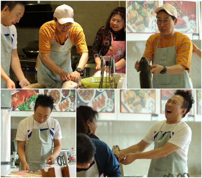 하지만 곧이어 또 다른 재료로 대형 잉어가 등장하면서 이휘재, 박명수를 멘붕에 빠지게 했다. 지난 방송에서 ‘맨손 붕어 비늘긁기 스킬’로 화제가 됐던 중국 어머니는 대형 잉어마저 거침없이 맨손으로 손질하기 시작했지만, 두 사람은 대형 잉어를 테이블로 옮기는 것부터 난항을 겪은 것. 잉어의 아가미를 들어 올리다가 잉어가 살아 있는 것을 알고 혼비백산한 이휘재와 박명수는 결국 어머니의 시범을 본 후 겨우 맨손으로 비늘긁기에 나섰다.