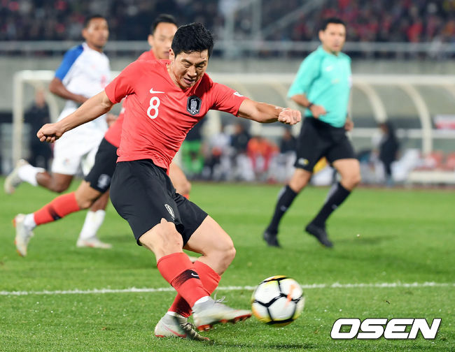 전반 9분 중원에서 황인범이 쇄도하던 이용에게 롱패스를 전했다. 이용이 사이드라인 끝에서 칼 같은 크로스를 올리자, 페널티 박스 안에서 대기하던 남태희가 발리 슈팅으로 선제골을 기록했다.